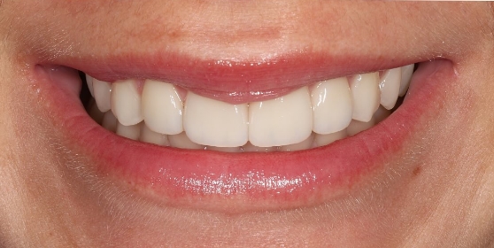 This patient’s worn, yellow teeth were transformed with 10 custom veneers into a brighter, age-appropriate smile that enhances her appearance without looking overdone.