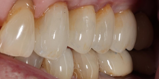 This implant bridge and crown were carefully crafted to match the surrounding teeth. The result is a full, confident smile that looks natural and makes it impossible to tell teeth were ever missing.
